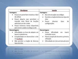 O Joomla é um sistema de gerenciamento de conteúdo open source desenvolvido em PHP que permite a criação de sites dinâmicos. Ele oferece recursos como templates, módulos, componentes e suporte a vários idiomas. Algumas vantagens incluem código aberto, gerenciamento de conteúdo, e uma comunidade ativa que mantém o sistema estável e seguro.