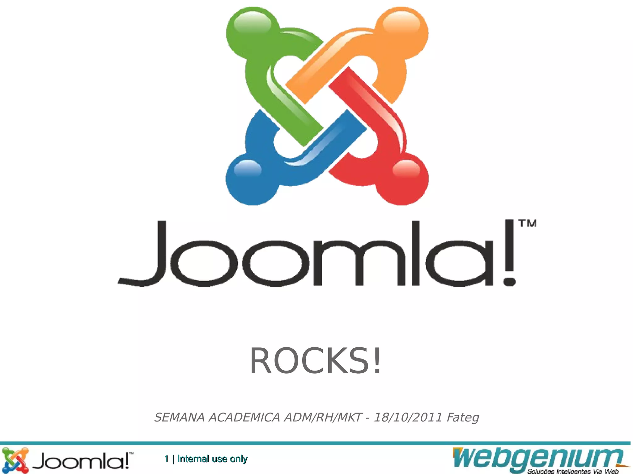 Este documento fornece uma introdução ao CMS Joomla, incluindo como instalá-lo e utilizá-lo para criar sites. É explicado que Joomla é uma plataforma open source para criação de sites e portais, e que pode ser usado para criar diferentes tipos de sites e sistemas web. O documento também discute como configurar categorias, artigos, menus e usuários no Joomla.