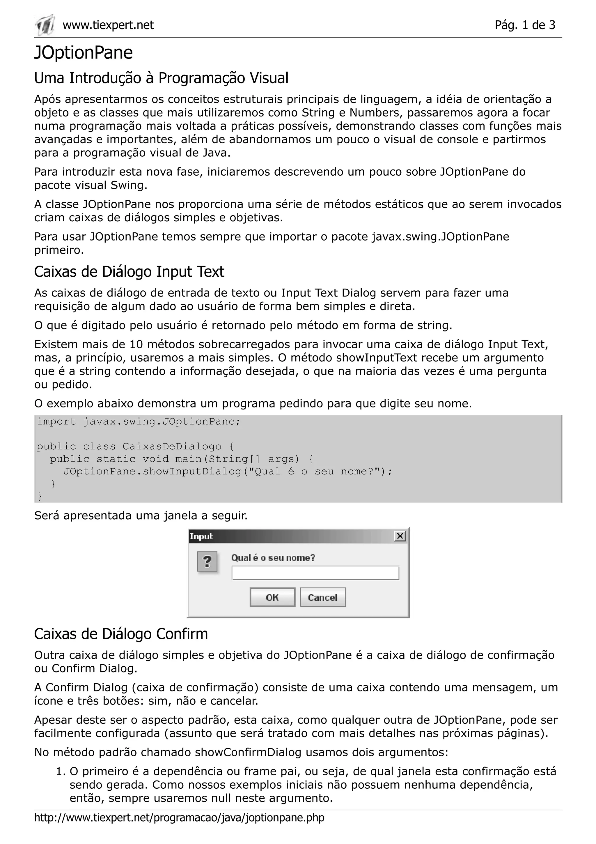 O documento descreve a classe JOptionPane em Java, que fornece métodos para criar caixas de diálogo simples. Ele explica como usar caixas de diálogo de entrada de texto, confirmação e mensagens, mostrando exemplos de código.