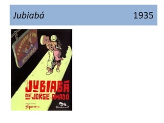 O documento resume a vida e obra do escritor brasileiro Jorge Amado. Ele é conhecido por obras como Gabriela, Cravo e Canela e Capitães da Areia, que se tornaram sucessos internacionais e ajudaram a mostrar o Brasil para o mundo. Suas histórias retratam personagens e aspectos da cultura brasileira de forma colorida e envolvente. Jorge Amado sofreu perseguição política durante a ditadura militar brasileira, mas suas obras continuam sendo adaptadas para o cinema e TV até hoje.