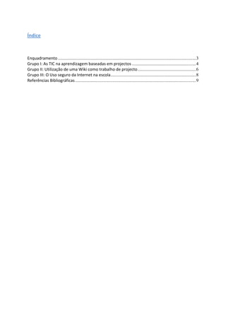 Este documento discute três tópicos principais sobre o uso de tecnologias de aprendizagem colaborativa: 1) O uso de projetos baseados em TIC para estimular a aprendizagem ativa dos alunos; 2) O uso de wikis para projetos, permitindo a colaboração; 3) A importância de ensinar o uso seguro da internet na escola.