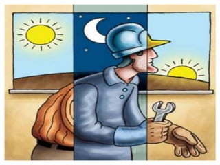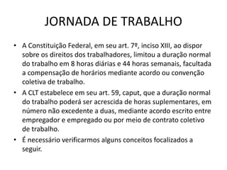 O documento discute as regras sobre jornada de trabalho no Brasil, incluindo a duração máxima permitida de 8 horas diárias e 44 horas semanais, acordos de compensação de horas e regimes especiais como 12 horas de trabalho por 36 horas de descanso.