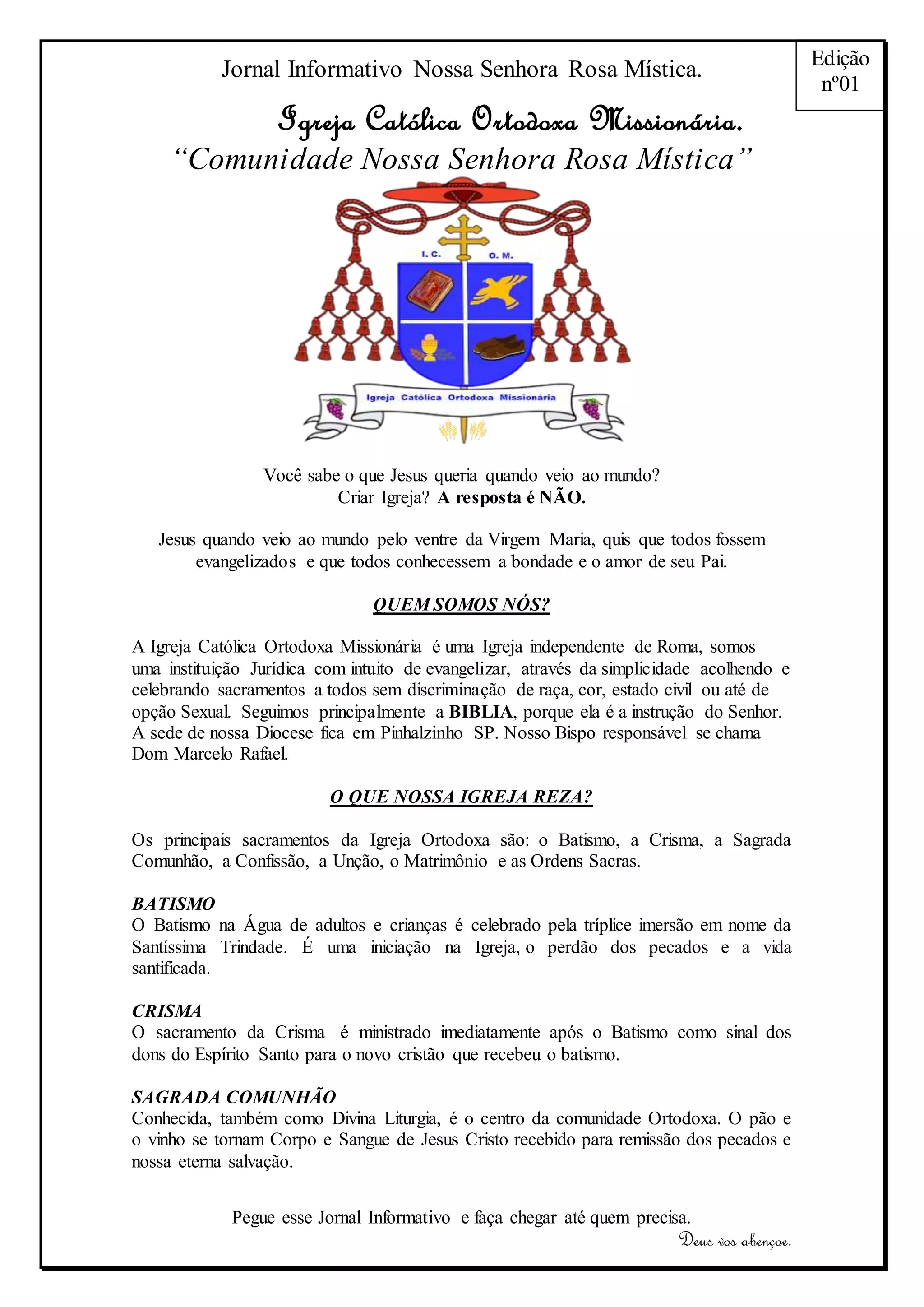 Este jornal apresenta a Igreja Católica Ortodoxa Missionária, uma igreja independente de Roma que prega a simplicidade e acolhimento de todos. Ele descreve os principais sacramentos celebrados como batismo, crisma, comunhão e explica que os sacramentos são gratuitos e podem ser celebrados em diversos locais.