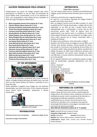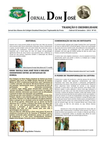 O documento resume as principais atividades e notícias do Colégio Estadual Dom José Tupinambá da Frota em setembro de 2011, incluindo a comemoração do Dia do Estudante, os resultados do ENEM que colocaram a escola em primeiro lugar entre as estaduais de Sobral, e alunos premiados pelo SPAECE.