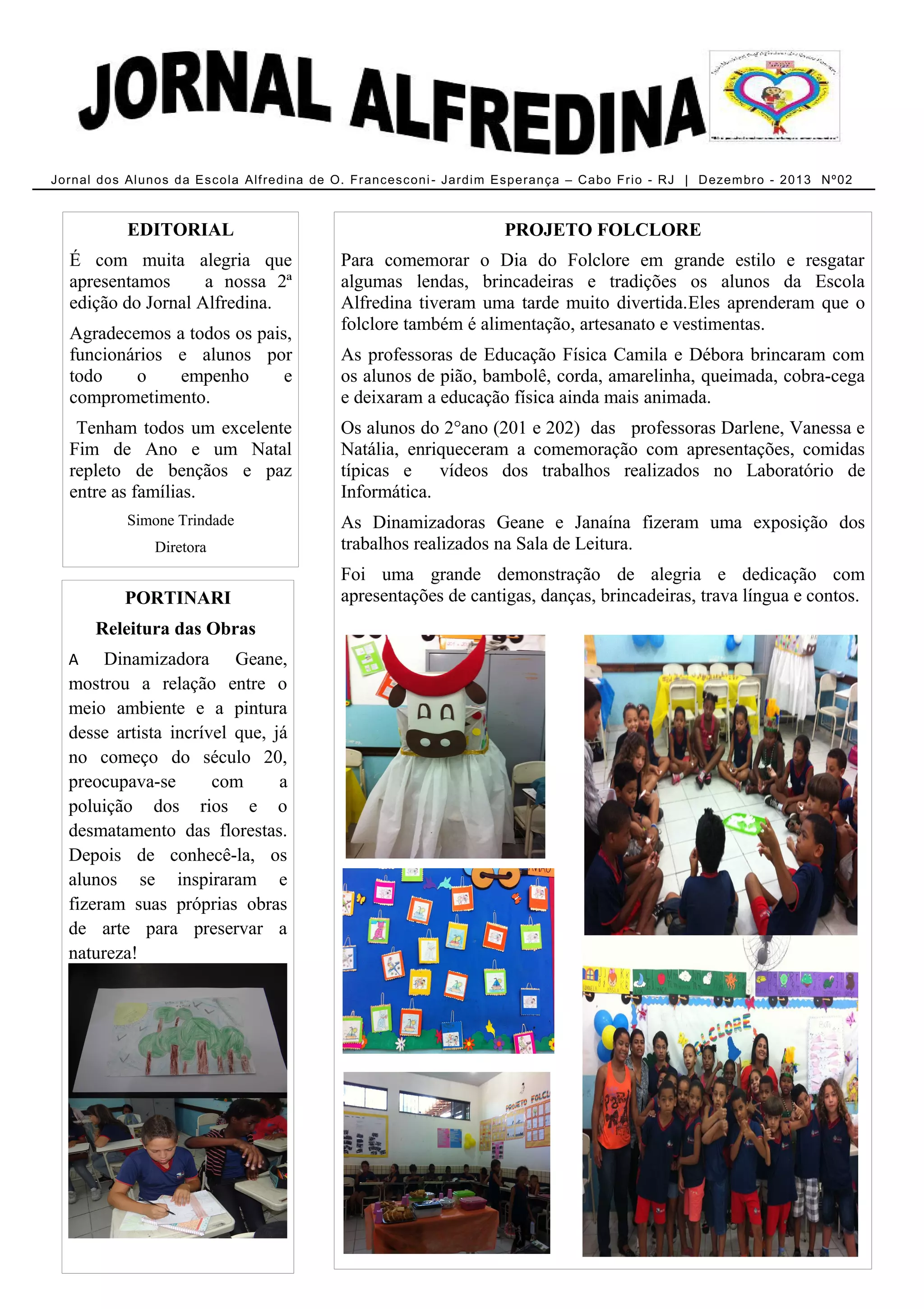 O documento resume as atividades realizadas na Escola Alfredina de O. Francesconi em Cabo Frio no mês de dezembro de 2013, incluindo comemorações do Dia do Folclore, Dia das Crianças, visita ao Teatro Municipal e Desfile Cívico. Projetos sobre Portinari, Vinícius de Moraes, trânsito seguro e bullying também foram descritos.