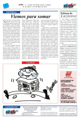 O documento discute a valorização imobiliária em Santa Luzia e região, com investimentos de grandes empresas melhorando a economia local. Também destaca um grupo de amigos que transformou um lixão em campo de futebol para a comunidade e uma associação que oferece cursos profissionalizantes para promover qualidade de vida no bairro Londrina. Por fim, o editorial apresenta o novo jornal Ação e seu compromisso em melhorar a cidade através do trabalho e boas ideias.