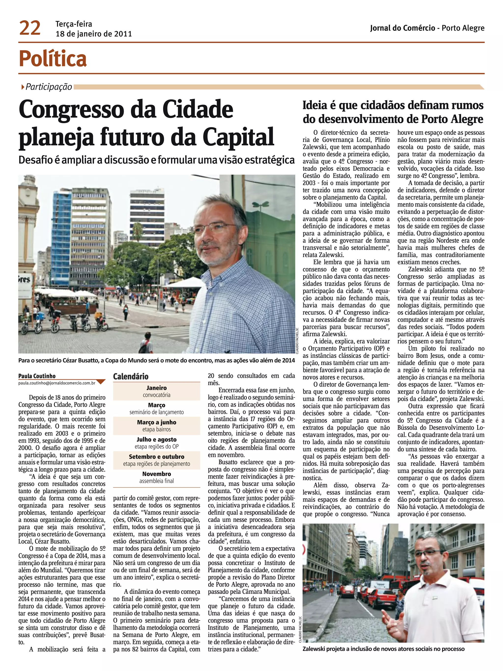 O documento descreve o planejamento para a quinta edição do Congresso da Cidade de Porto Alegre, que terá como objetivo ampliar a participação cidadã e formular uma visão estratégica de longo prazo para o desenvolvimento da cidade. O evento começará em janeiro com reuniões preparatórias e seguirá ao longo do ano com discussões nos bairros, regiões e assembleia final em novembro. A expectativa é que o congresso possa ajudar a criar um instituto permanente de planejamento urbano.