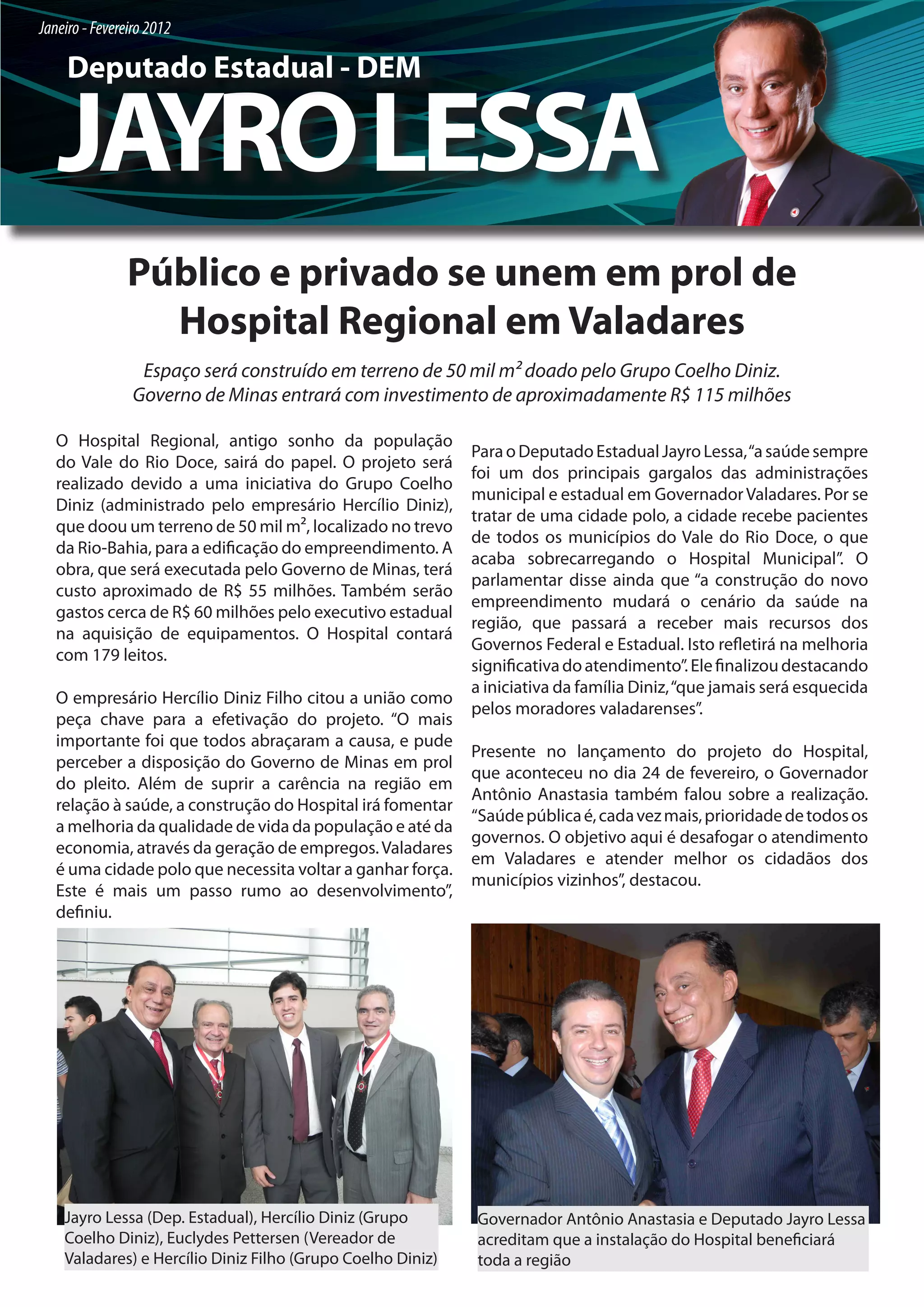 O documento resume iniciativas para a construção de um Hospital Regional em Valadares e discussões sobre a dívida pública de Minas Gerais com a União. O Grupo Coelho Diniz doou terras e o Governo de Minas investirá R$ 115 milhões no hospital. A Assembleia Legislativa debateu a alta dívida do estado, que compromete investimentos em saúde e educação.