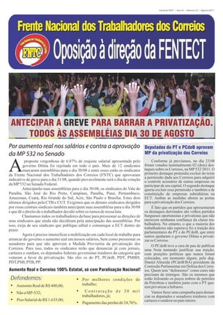 O documento relata sobre a proposta de reajuste salarial de 6,87% apresentada pelo governo Dilma que foi rejeitada. Vários sindicatos marcaram assembleias para o dia 30/08 e aprovaram indicativo de greve para o dia 31/08. Também fala sobre a votação da MP 532 no Senado que abre caminho para a privatização dos Correios e sobre a traição de parlamentares do PT e PCdoB que votaram a favor da medida.