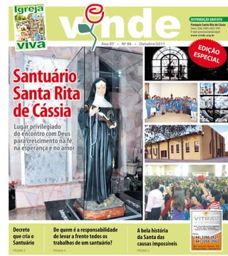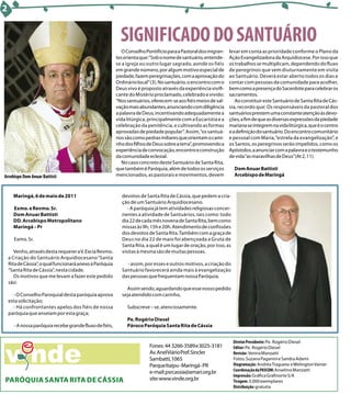 O documento discute a criação de um Santuário Arquidiocesano de Santa Rita de Cássia anexo à Paróquia de Santa Rita de Cássia em Maringá. O Arcebispo Dom Anuar Battisti decreta a criação do Santuário e concede privilégios espirituais aos fiéis que o frequentarem. A responsabilidade de administrar o Santuário é compartilhada entre o pároco, o Conselho Pastoral Paroquial e as diversas pastorais e movimentos da paróquia.