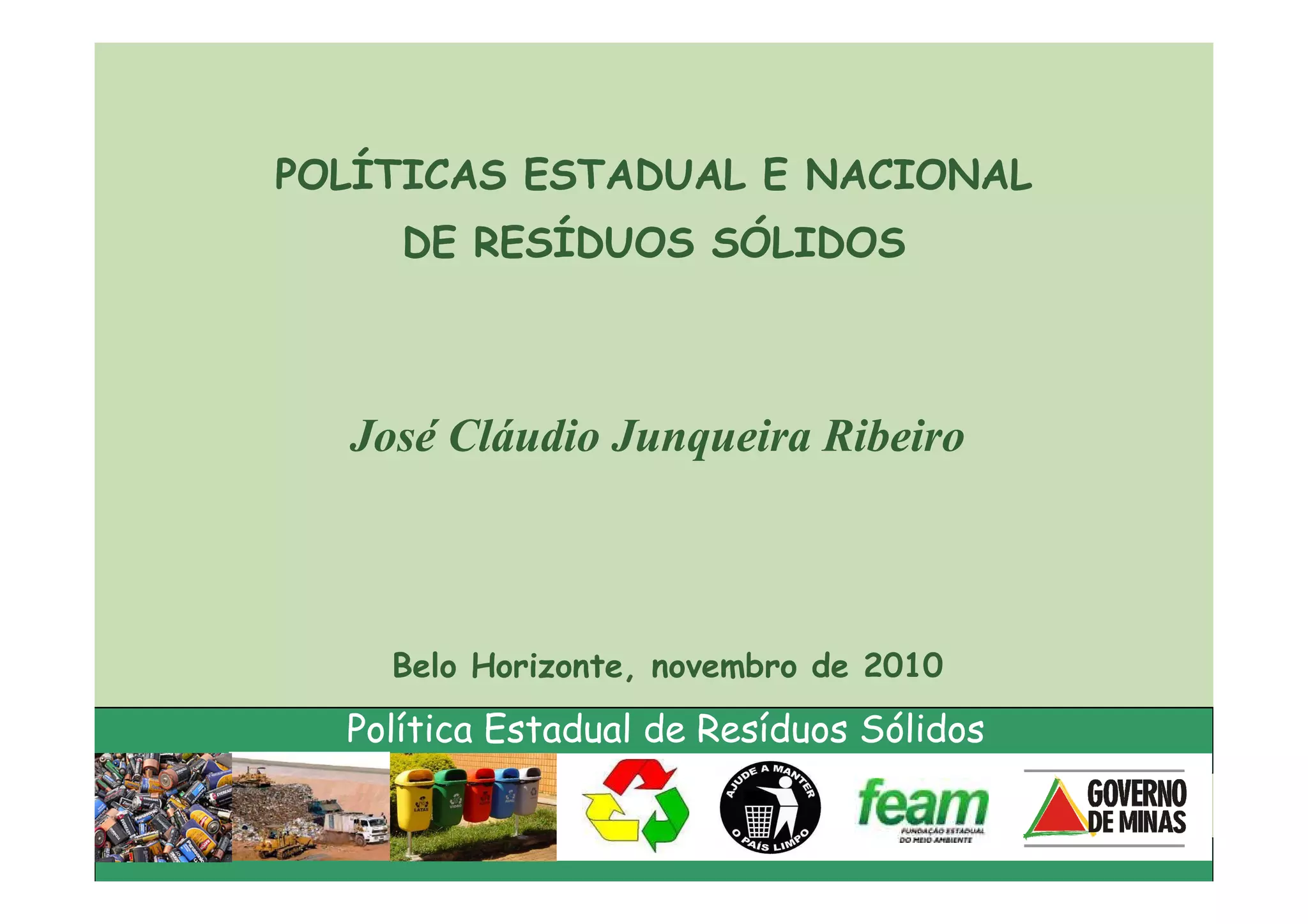 O documento descreve as políticas estadual e nacional de resíduos sólidos no Brasil, definindo resíduos sólidos, gestão de resíduos, valorização de resíduos, logística reversa, princípios, diretrizes, objetivos, instrumentos, obrigações, proibições e penalidades associadas às políticas.