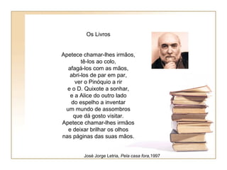O poema descreve a relação afetuosa que o autor tem com os livros, vendo-os como irmãos. Gosta de segurar os livros, abri-los e imaginar as histórias e personagens neles contidas, como Pinóquio, Dom Quixote e Alice no País das Maravilhas. O autor aprecia esta relação com os livros e gosta de ver os seus olhos brilharem ao lê-los.