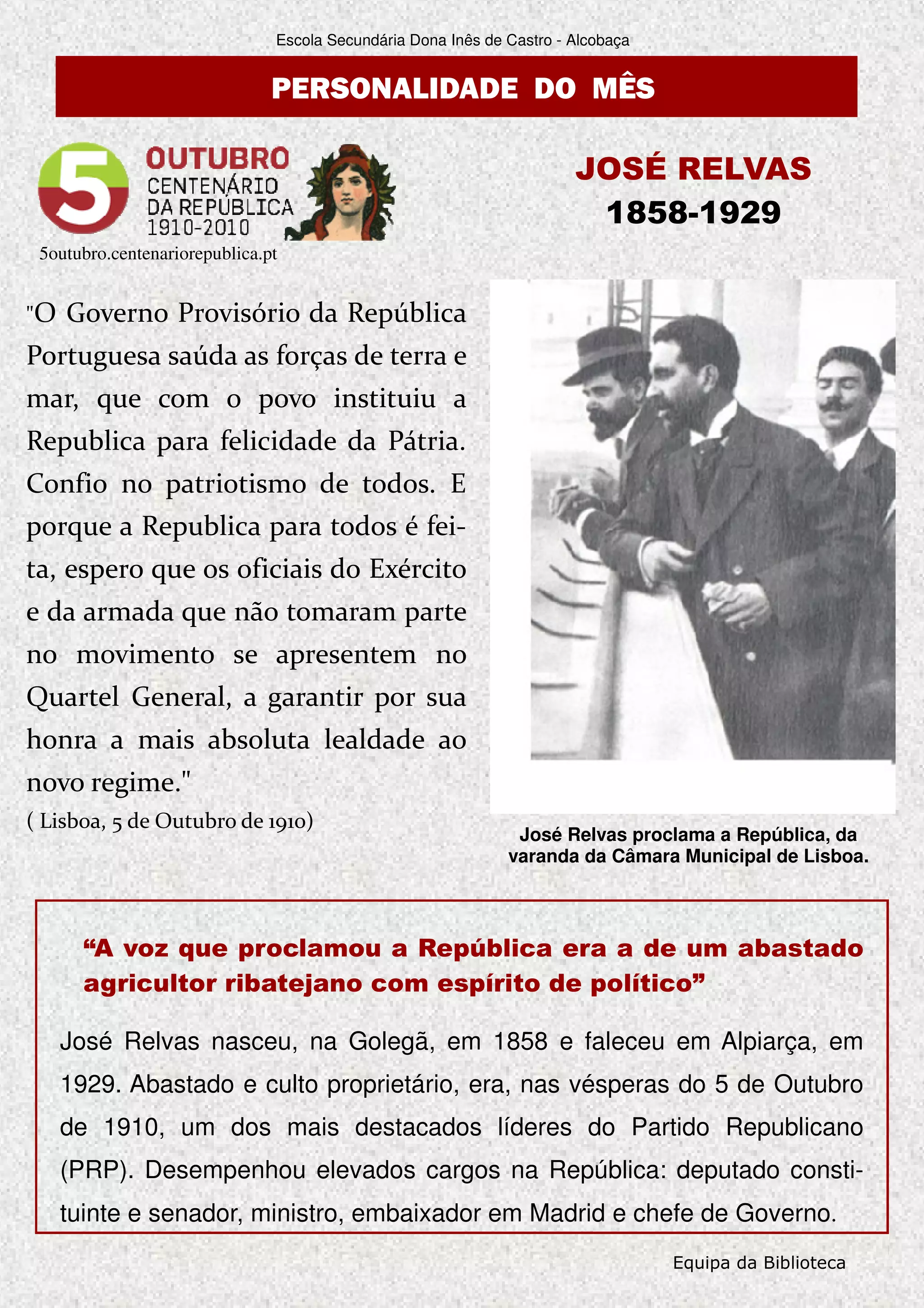 Este documento descreve José Relvas, o homem que proclamou a República Portuguesa em 5 de Outubro de 1910. Relvas era um abastado agricultor do Ribatejo com espírito político. Ele leu a proclamação da República da varanda da Câmara Municipal de Lisboa, estabelecendo o novo regime e pedindo lealdade das forças armadas. Relvas teve uma carreira política de destaque na Primeira República, ocupando cargos como deputado, senador e ministro.