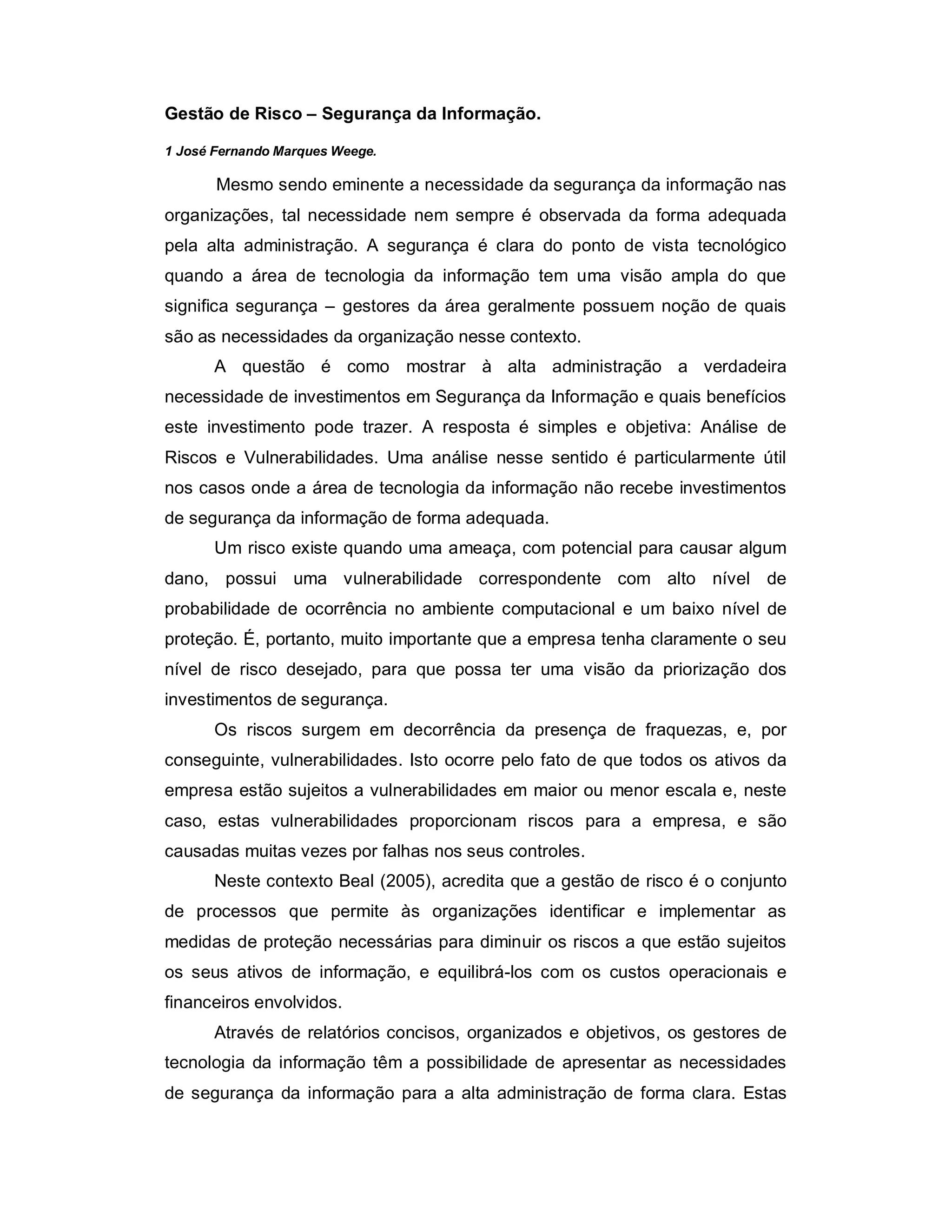 Este documento discute a importância da análise de riscos e vulnerabilidades para demonstrar à alta administração a necessidade de investimentos em segurança da informação. A análise de riscos permite identificar as falhas nos controles de segurança e priorizar os investimentos onde há maior risco. A gestão de riscos é essencial para equilibrar a proteção dos ativos de informação com os custos financeiros envolvidos.