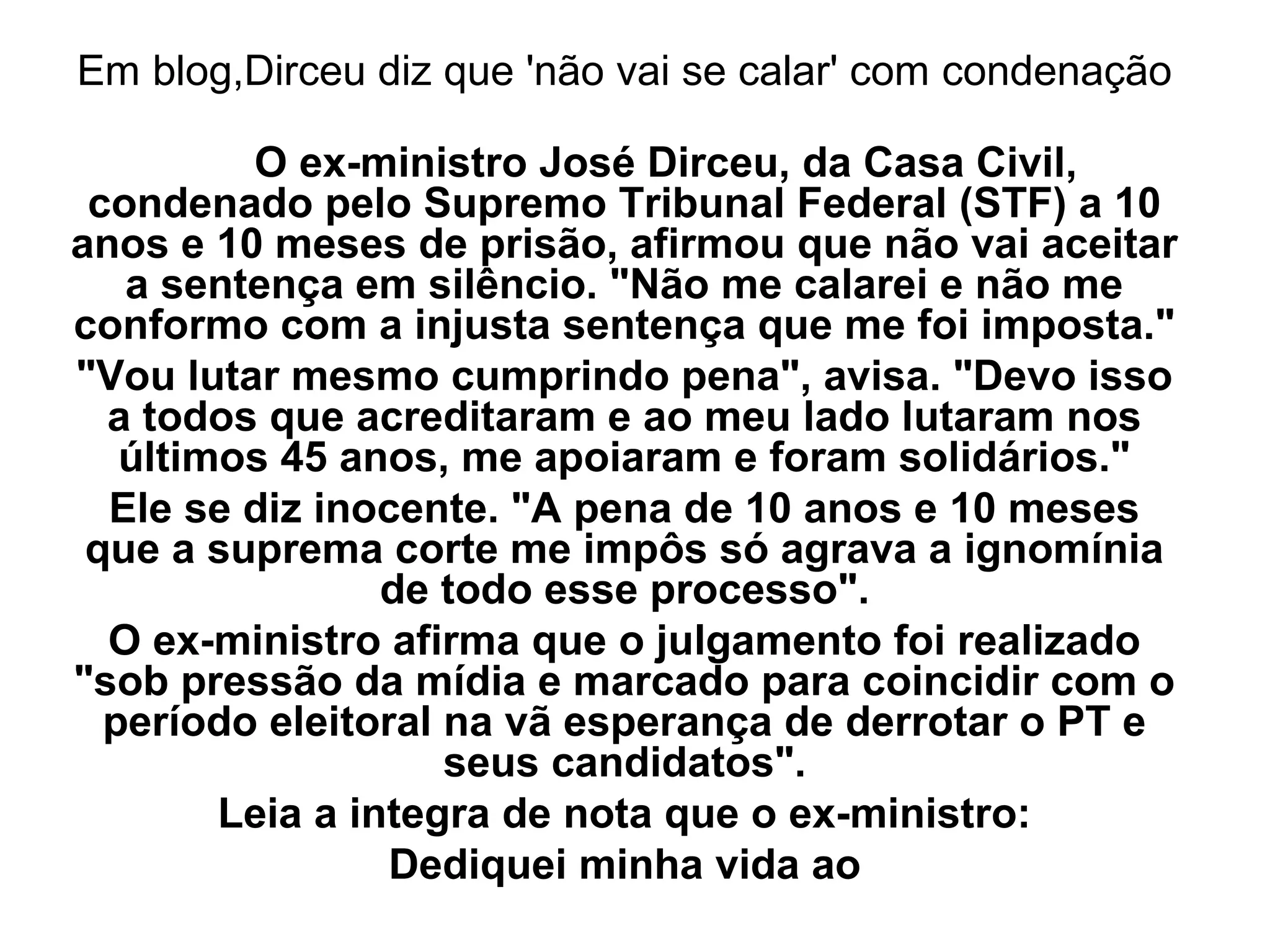 O ex-ministro José Dirceu foi condenado a 10 anos de prisão pelo STF. Ele afirma ser inocente e que o julgamento foi realizado sob pressão midiática para prejudicar o PT. Dirceu diz que não vai aceitar a sentença em silêncio e que vai continuar lutando pelos ideais que defende apesar de cumprir pena.