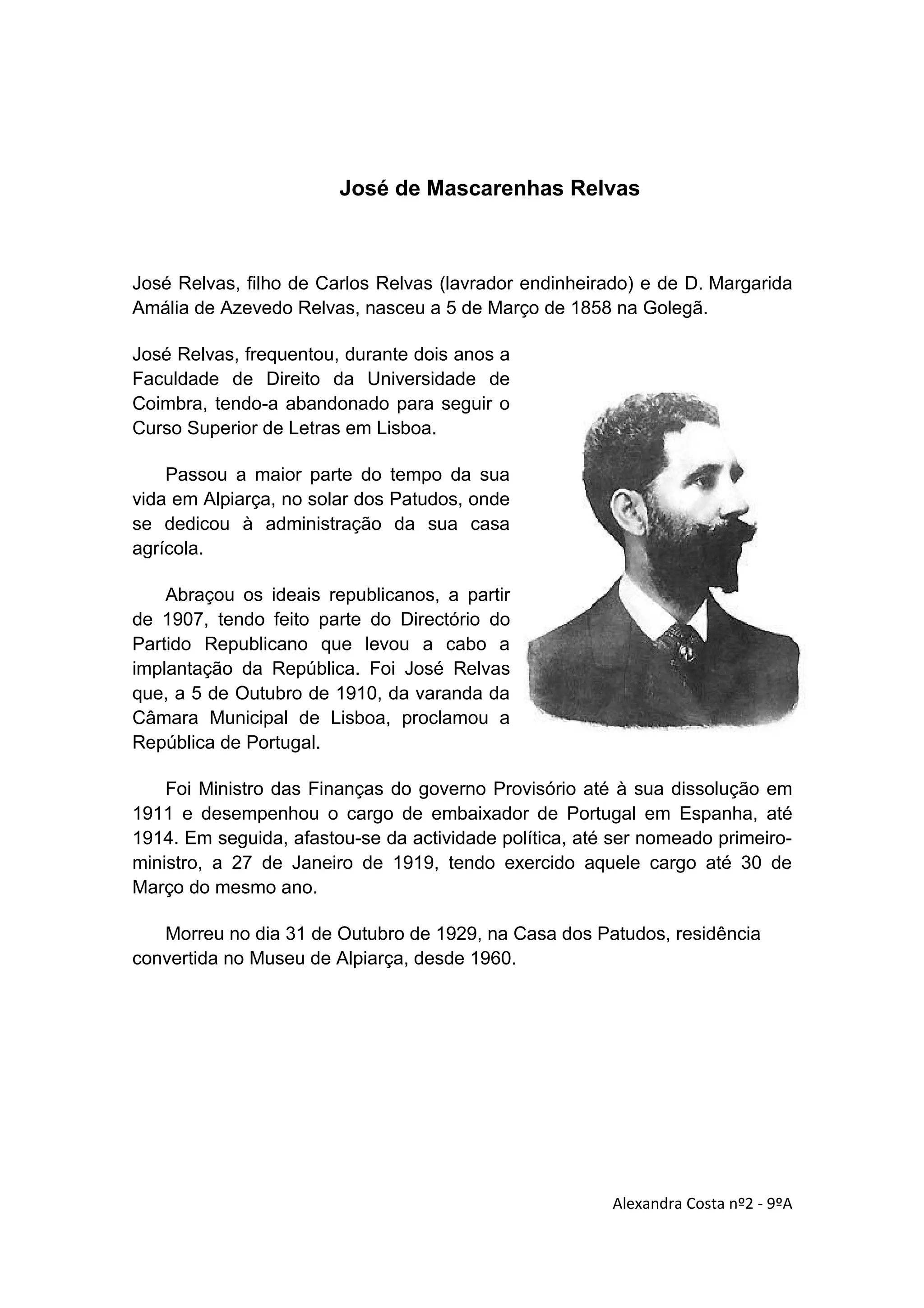José Relvas nasceu em 1858 na Golegã. Frequentou a Faculdade de Direito da Universidade de Coimbra e depois o Curso Superior de Letras em Lisboa. Abraçou os ideais republicanos em 1907 e foi ele que proclamou a República de Portugal em 1910 da varanda da Câmara Municipal de Lisboa. Foi Ministro das Finanças do governo Provisório até 1911 e embaixador de Portugal em Espanha até 1914.