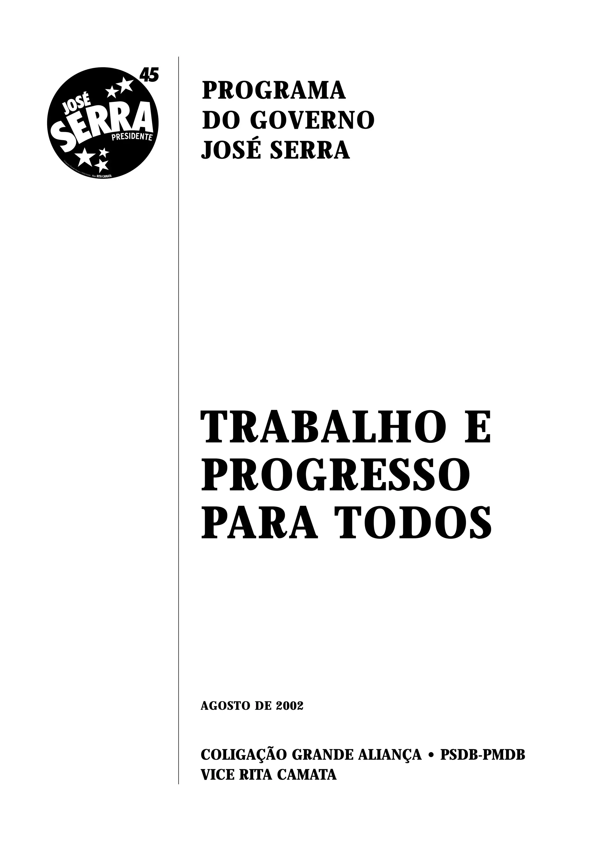 Este documento apresenta o programa de governo de José Serra para as eleições presidenciais de 2002. Ele destaca que a criação de oportunidades de trabalho será o principal objetivo, para promover o crescimento econômico e combater problemas como desemprego e pobreza. O documento também discute a necessidade de avançar nas conquistas democráticas e nas mudanças sociais iniciadas nos governos anteriores, mas que ainda precisam ser aprofundadas. A visão de José Serra é usar o crescimento para gerar emprego e recursos