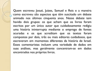 1) O documento discute a autoria dos livros de Josué, Juízes, Samuel e Reis