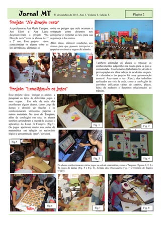 O documento relata sobre projetos realizados na Escola Municipal Marquês de Tamandaré, incluindo o Projeto Mais Educação que oferece oficinas de música, rádio, leitura e artes marciais. Também descreve projetos como "Na Direção Certa" sobre educação no trânsito e "Investigando os Jogos" que estimulou alunos a pesquisar e construir jogos. Além disso, relata sobre a análise da qualidade da água da escola e da cidade de Ladário.