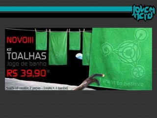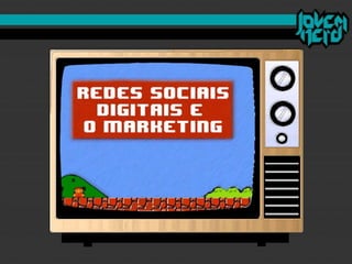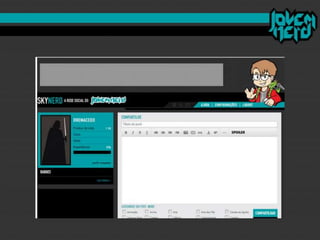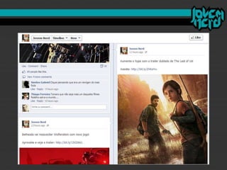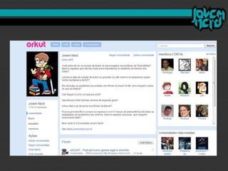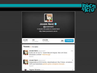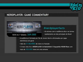 O documento discute como o "mercado nerd" se desenvolveu nos últimos anos e como o site brasileiro Jovem Nerd usou estratégias de comunicação e marketing digital de forma eficiente. O Jovem Nerd criou uma comunidade online através de plataformas como Orkut, Twitter, Facebook e seu próprio podcast e vídeos, e atraiu anunciantes para seu público alvo nerd.