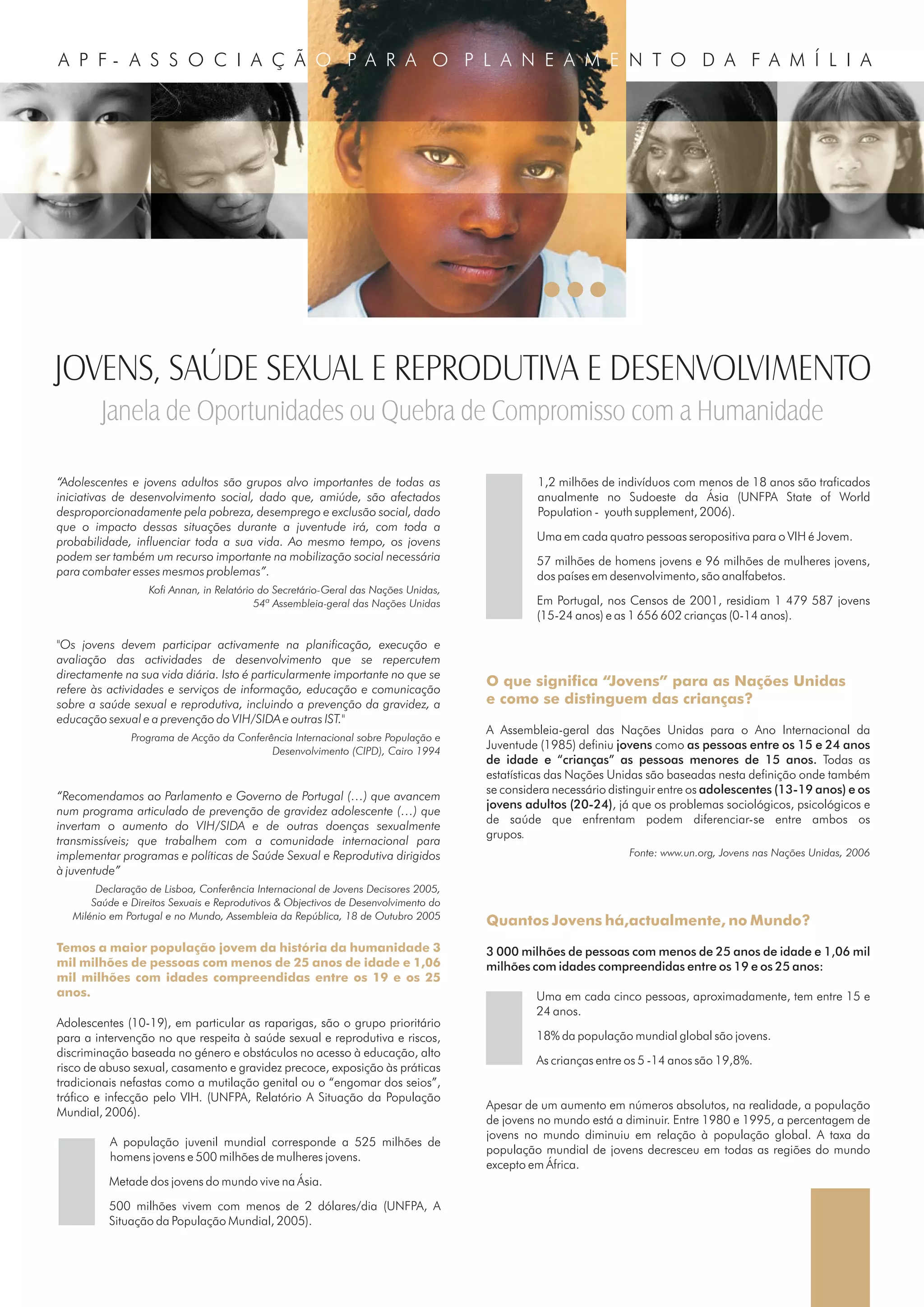 O documento discute questões relacionadas à saúde e direitos sexuais e reprodutivos dos jovens. Ele destaca que os jovens são desproporcionalmente afetados por problemas como pobreza e desemprego e que programas de saúde sexual e reprodutiva são essenciais para seu desenvolvimento. Além disso, discute desafios específicos enfrentados por jovens mulheres, como gravidez precoce, mutilação genital feminina e violência de género.