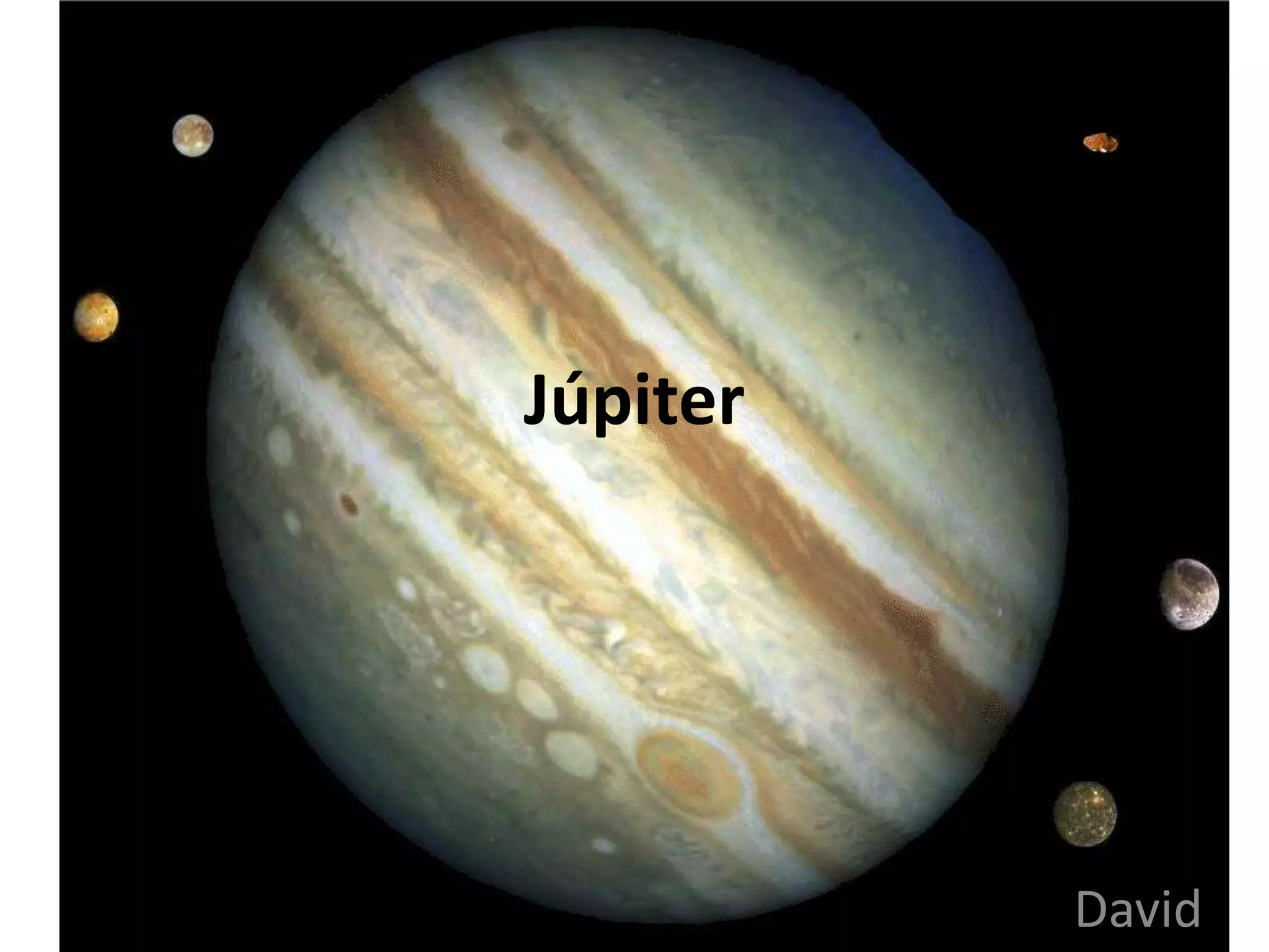Júpiter é o maior planeta do Sistema Solar, com um núcleo denso de gelo e rochas cercado por uma grande camada de hidrogênio e uma atmosfera espessa. Quando observado por um telescópio, aparece como um disco amarelo com faixas escuras ao redor, e possui cerca de quinze luas, incluindo Io, Ganimedes, Europa e Calisto.