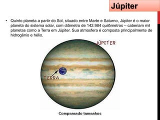 O documento resume as principais características dos planetas Júpiter e Saturno no Sistema Solar. Júpiter é o maior planeta e tem uma atmosfera composta principalmente por hidrogênio e hélio, enquanto Saturno é reconhecido por seus anéis e possui a menor densidade entre os planetas gigantes. Ambos foram explorados por sondas espaciais para obter mais informações sobre sua composição e dinâmica.