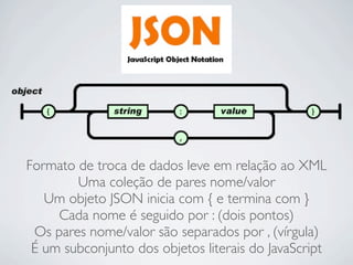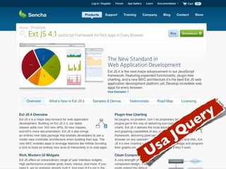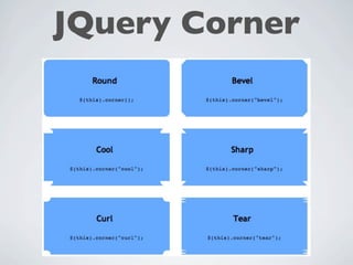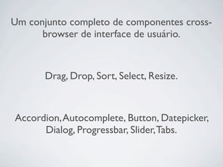 O documento apresenta uma introdução ao framework jQuery. Ele discute a filosofia, vantagens e exemplos de uso do jQuery, incluindo seletores, funções e eventos. Além disso, o documento aborda plugins populares como jQuery UI, DataTables e Flot que podem ser usados junto com o jQuery.