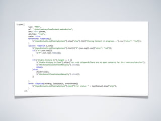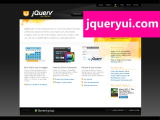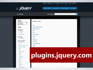 jQuery simplifica a interação entre HTML e JavaScript permitindo "escrever menos e fazer mais". Oferece seletores, métodos para manipular o DOM, eventos, efeitos e Ajax de forma simples e cross-browser. Plugins podem ser criados para estender suas funcionalidades.