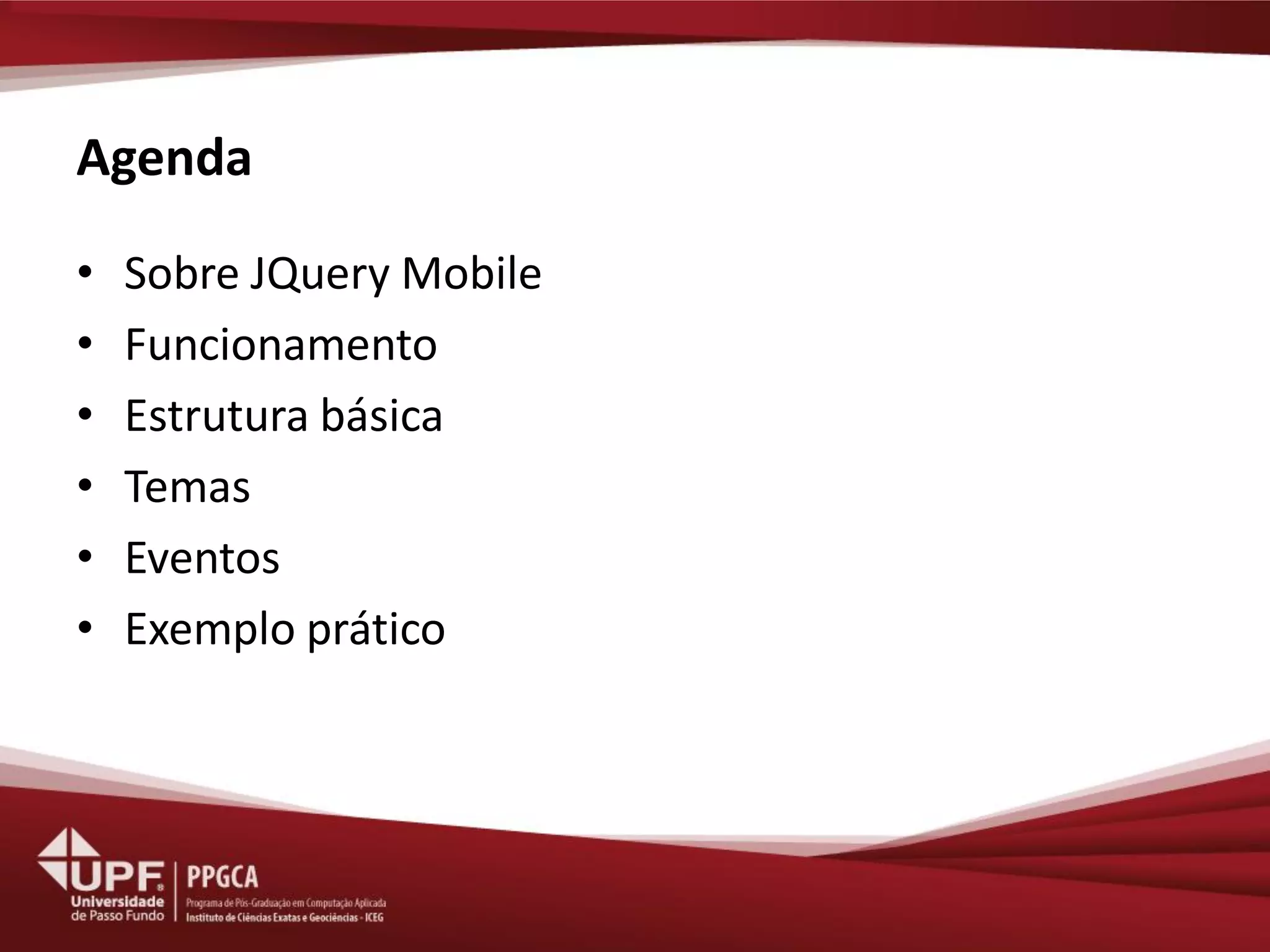 O documento apresenta uma introdução ao framework JQuery Mobile, descrevendo sua estrutura, temas, eventos e exemplos práticos. É destacado que se trata de uma biblioteca para criação de interfaces responsivas em múltiplos dispositivos, baseada em HTML5, CSS e Javascript. Sua estrutura básica utiliza containers como header, main e footer dentro de páginas definidas por data-role="page".