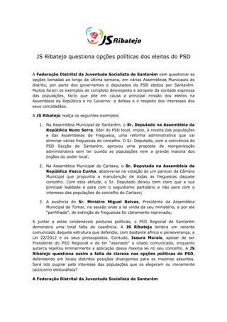 A Juventude Socialista de Ribatejo critica as decisões políticas do PSD em Santarém, apontando diversos exemplos de desrespeito às vontades das populações em assembleias municipais. A organização questiona a coerência das posturas do PSD, que defende uma reforma administrativa enquanto seus líderes não ouvem a comunidade local. O comunicado ressalta a necessidade de os eleitos priorizarem os interesses da população em vez de táticas eleitorais.