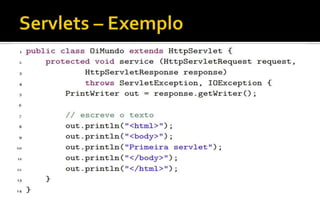 O documento explora a tecnologia JavaServer Pages (JSP) e seu papel no desenvolvimento de aplicações web dinâmicas, abordando a importância de entender servlets e outros conceitos básicos. Além disso, discute os desafios de manutenção de código em servlets em comparação ao JSP, que permite uma integração mais elegante entre HTML e Java. Por fim, apresenta o padrão Model-View-Controller (MVC) como uma abordagem estrutural essencial para separar a lógica de negócios da apresentação na web.