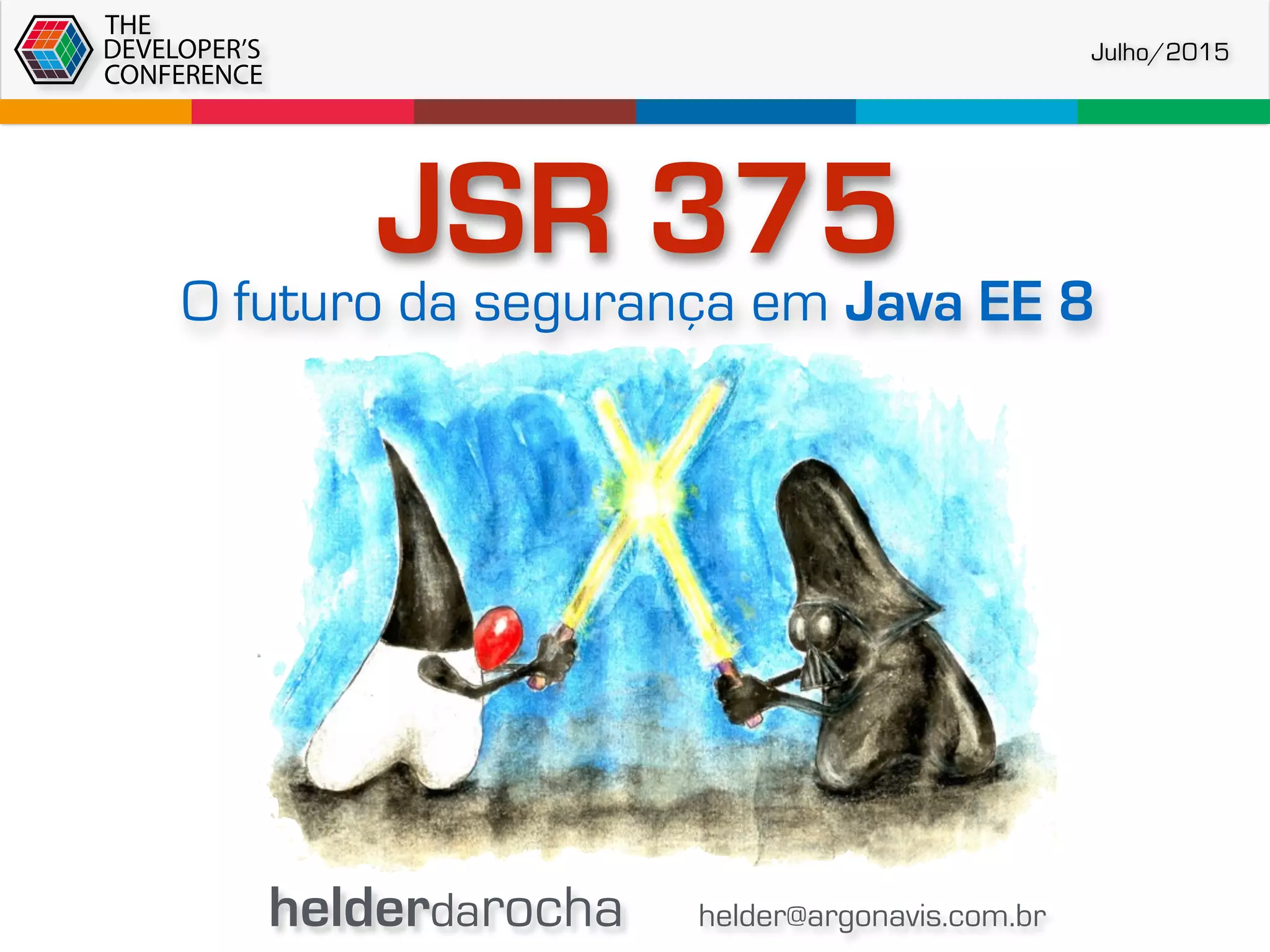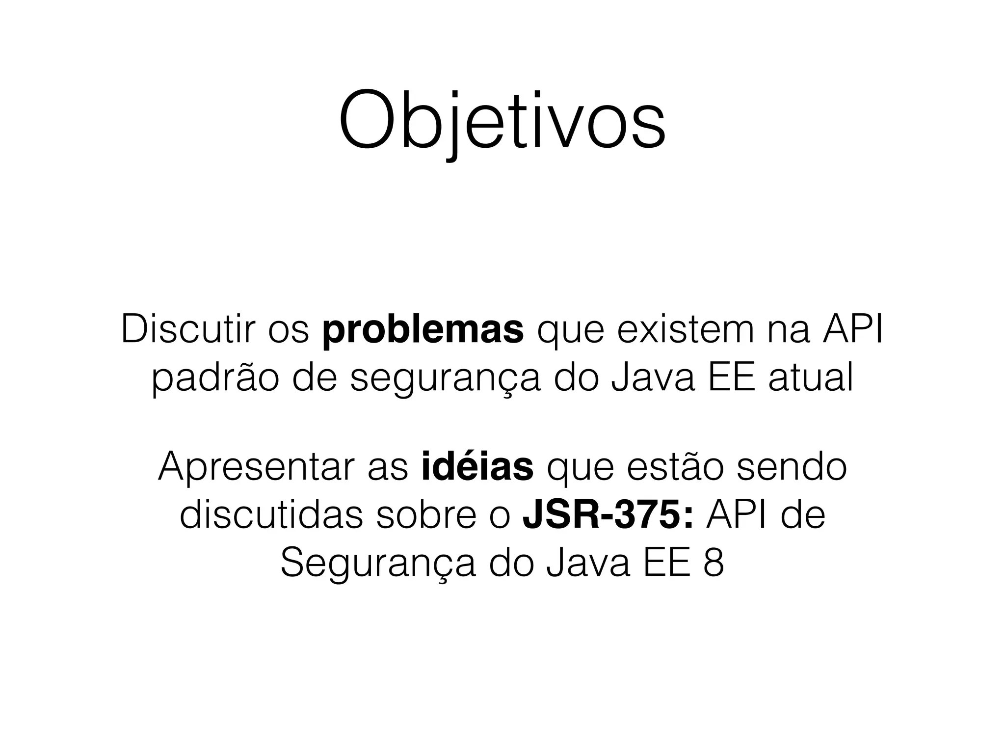O documento discute as propostas para o JSR-375, que visa modernizar e simplificar a API de segurança do Java EE. As principais idéias incluem: 1) introduzir uma terminologia unificada; 2) simplificar a API de autenticação; e 3) fornecer uma API padronizada para armazenamento de identidades.