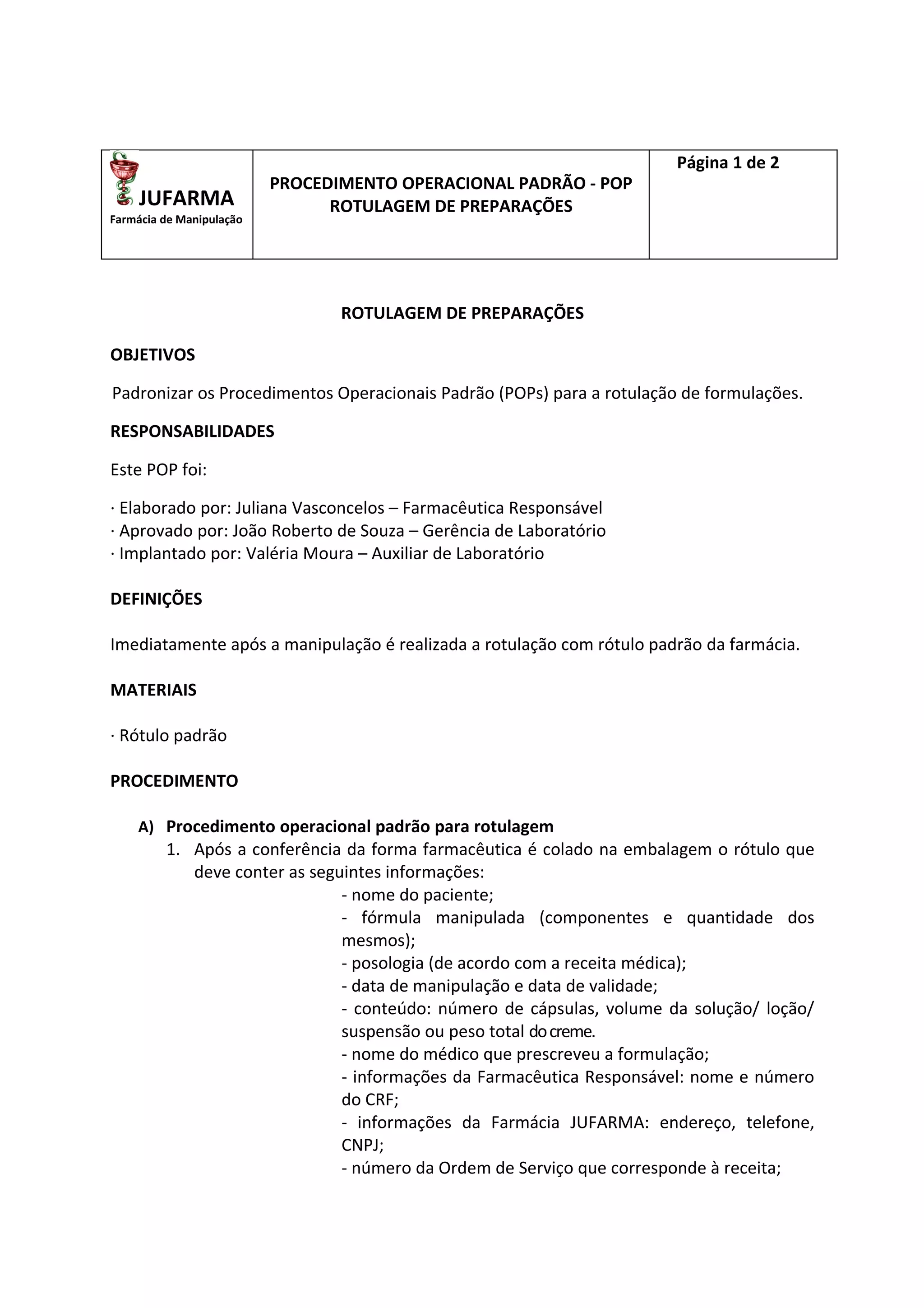 Este documento descreve os procedimentos padrão para rotulagem de preparações em uma farmácia, incluindo colocar rótulos com informações do paciente, formula, data de validade e outras informações relevantes. Também especifica como armazenar as preparações rotuladas na farmácia.