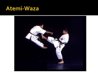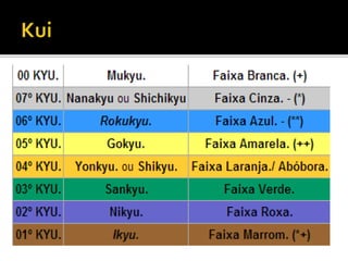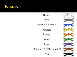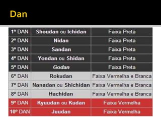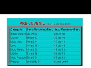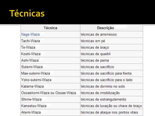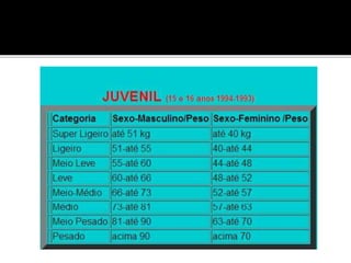 O judô foi criado no Japão em 1882 por Jigoro Kano como uma arte marcial baseada no jujutsu. Seu nome significa caminho suave e ensina princípios como eficiência com esforço mínimo. As competições objetivam imobilizar o oponente ou fazê-lo tocar as costas no tatame para marcar pontos.
