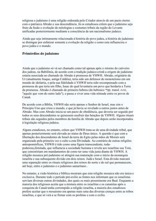 O judaísmo é a religião do povo judeu, surgida da religião mosaica e que defende a crença monoteísta em YHWH como criador e Deus e a eleição de Israel como povo escolhido. Há diversas tradições dentro do judaísmo que evoluíram ao longo do tempo e dos eventos históricos, como o uso de objetos religiosos e costumes alimentares e culturais.