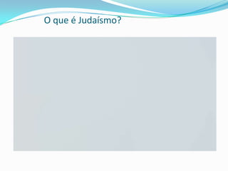 O documento fornece um resumo sobre o Judaísmo, incluindo sua fundação, livro sagrado, ritos, crenças, festas e a criação do Estado de Israel. Aborda desde os princípios do Judaísmo com Abraão e Moisés até as tendências atuais e o conflito Israel-Palestina.