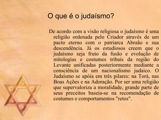 O documento descreve o que é o judaísmo, sua história, práticas e ramificações. O judaísmo é uma religião baseada em um pacto entre Deus e Abraão, com três pilares principais: a Torá, boas ações e adoração. Existem diferentes visões sobre quem é considerado judeu e sobre a figura do Messias. O documento também explica festas, calendário, símbolos e ramificações do judaísmo como ortodoxo, conservador e reformista.
