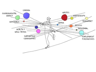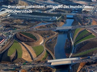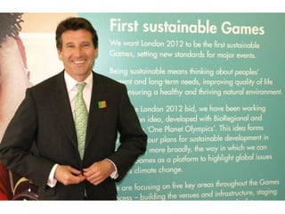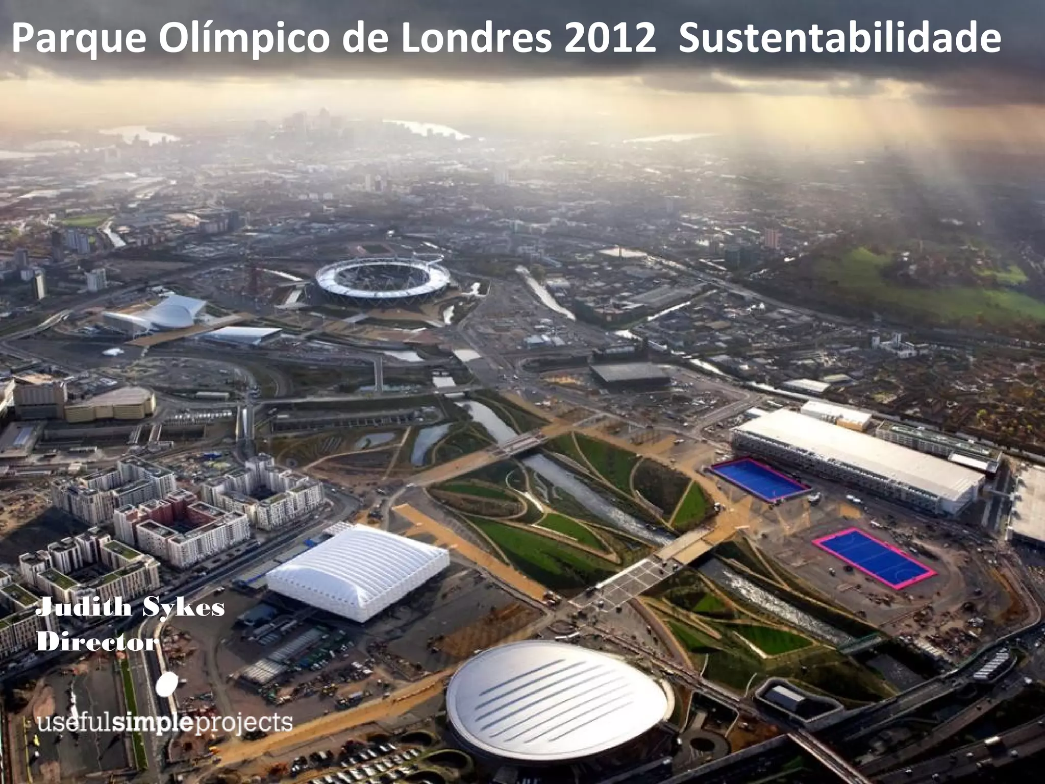 O documento discute a estratégia de desenvolvimento sustentável do Parque Olímpico de Londres 2012, que inclui metas de desempenho relacionadas a carbono, água, lixo, materiais, biodiversidade e outras áreas. A estratégia levou a conquistas como a reutilização de 98,5% dos materiais de demolição e o uso de 100% de madeira certificada. O documento também fornece recomendações sobre o cálculo e mitigação da pegada de carbono para a Copa do Mundo de 2014 no Brasil.