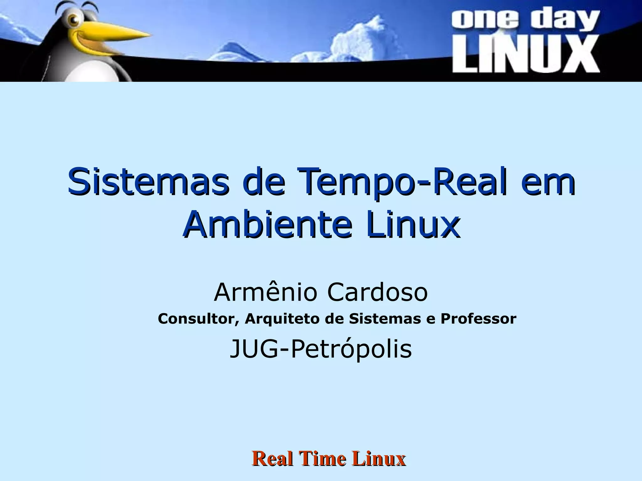 O documento discute sistemas de tempo-real em ambientes Linux, incluindo o que é tempo-real, tipos de sistemas de tempo-real, sistemas operacionais de tempo-real, Real Time Linux e exemplos de dispositivos e aplicações que utilizam sistemas de tempo-real baseados em Linux.