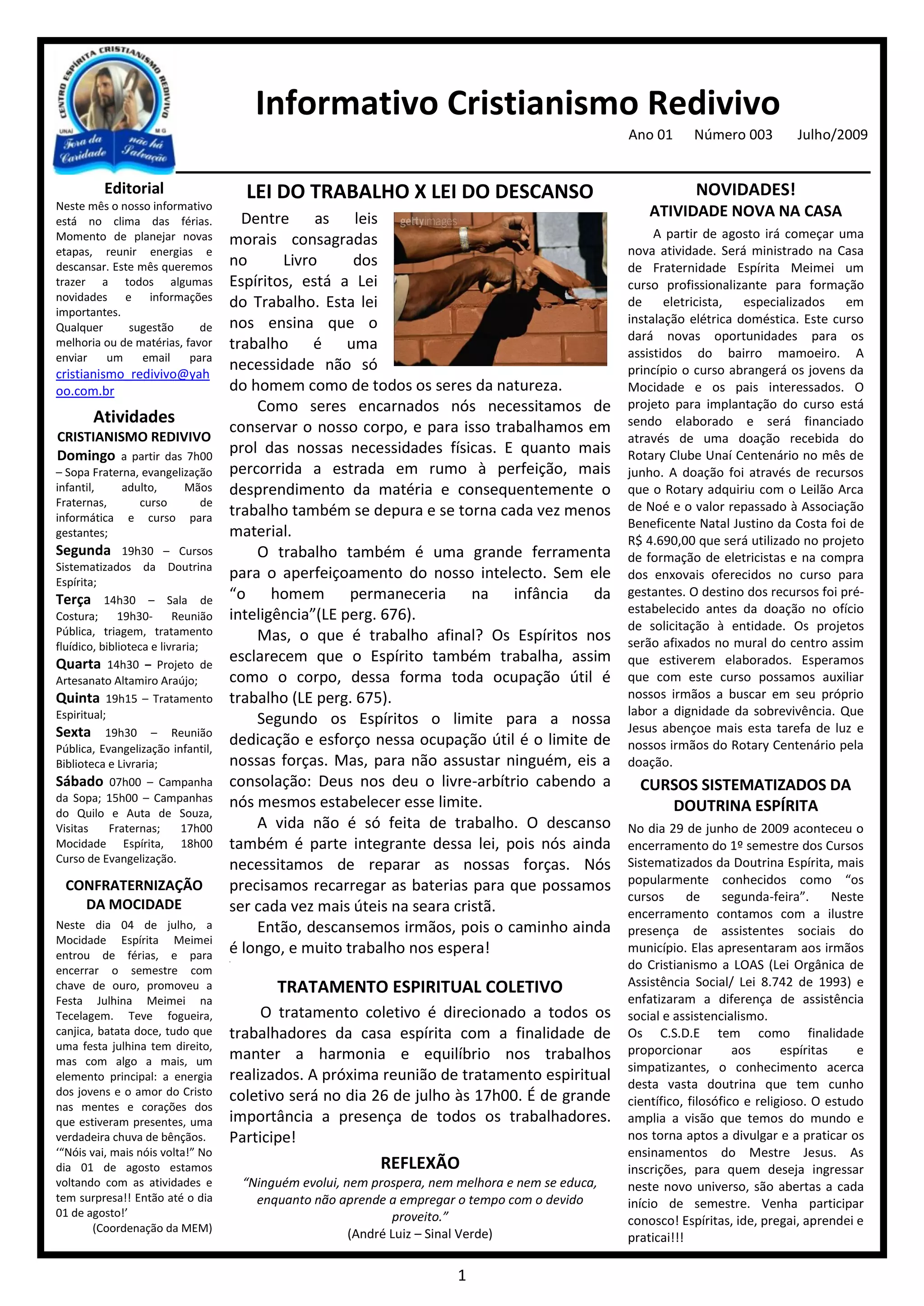 O informativo traz novidades sobre atividades e eventos realizados pelo Cristianismo Redivivo, como um curso profissionalizante de eletricista, comemoração dos 10 anos da Tecelagem Unaí e almoço beneficente na APAE. Também destaca artigos sobre a lei do trabalho e do descanso e reflexões espíritas.