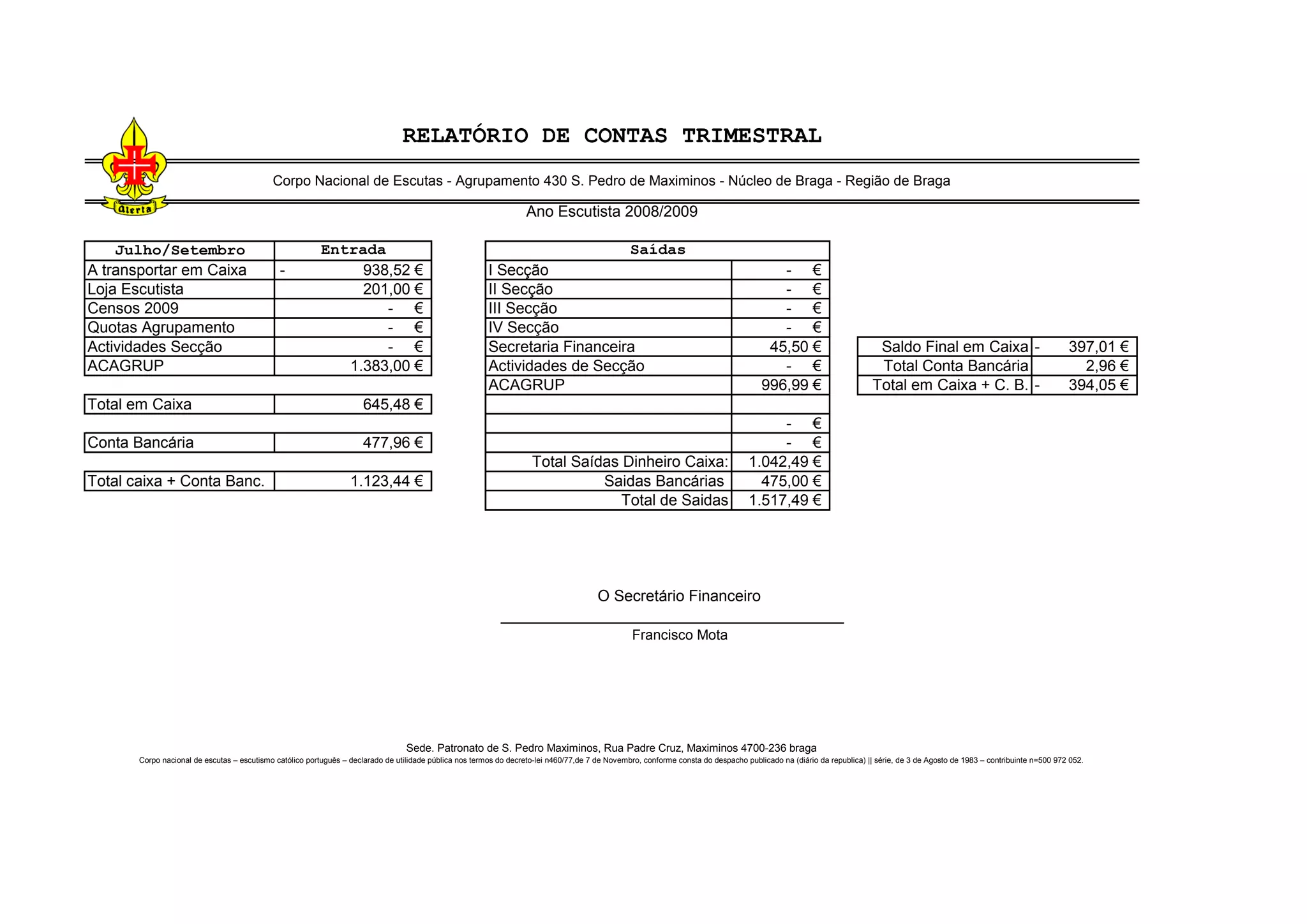 O relatório trimestral do Agrupamento 430 de Braga mostra um saldo final em caixa de 397,01€ após receitas de 1.383€ e despesas de 1.517,49€ no trimestre. As maiores receitas vieram da Loja Escutista (201€) e das Atividades de Secção (1.383€), enquanto as maiores despesas foram para as Atividades de Secção (996,99€) e saídas bancárias (475€).