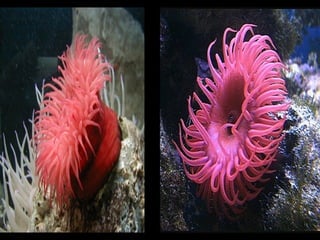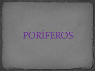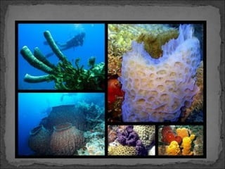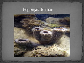 O documento discute as esponjas, um filo primitivo do reino animal. As esponjas são organismos aquáticos sésseis que se alimentam por filtragem de partículas de alimento através de seus poros. Embora simples sem órgãos, as esponjas possuem tecidos parcialmente diferenciados. Elas podem se reproduzir tanto sexualmente quanto assexualmente por gemulação ou fragmentação.