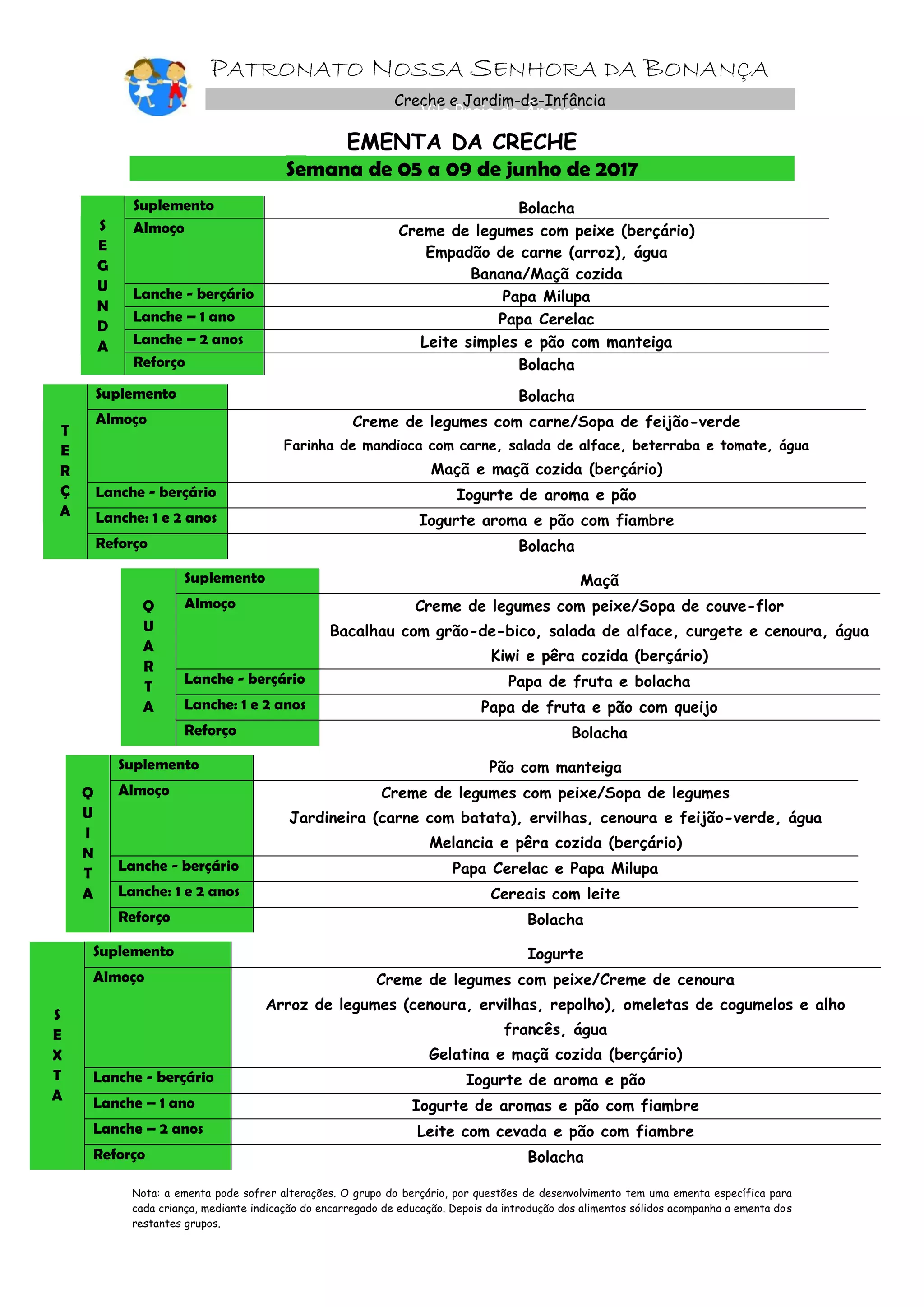 As ementas descrevem as refeições servidas em uma creche e jardim-de-infância para várias semanas, incluindo sopas, pratos principais e lanches para diferentes grupos etários. As refeições variam entre legumes, peixe, carne e cereais acompanhados de saladas, frutas e bolachas.