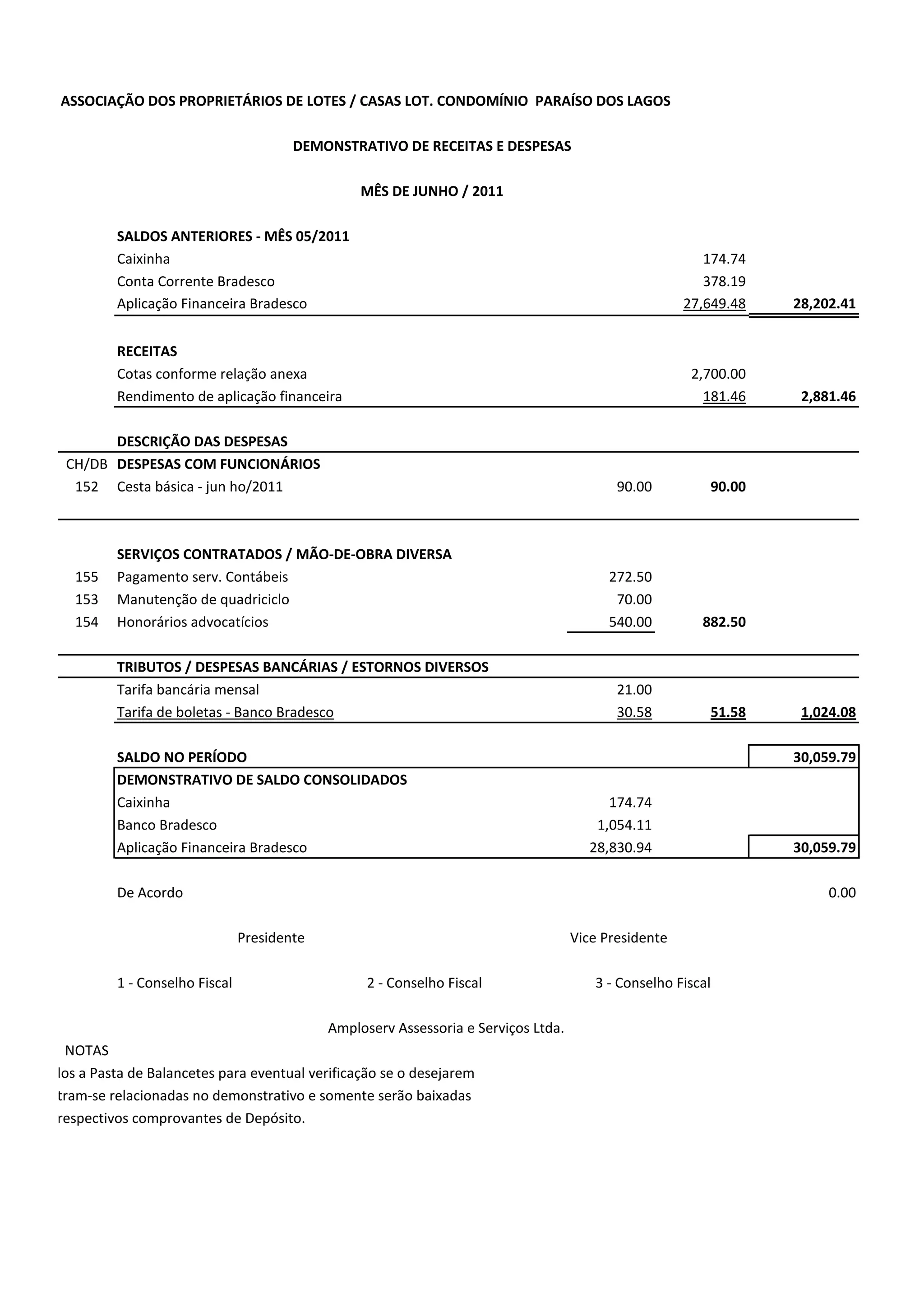 Este documento apresenta o demonstrativo de receitas e despesas do Condomínio Paraíso dos Lagos referente ao mês de junho de 2011. As receitas totalizaram R$2.881,46 provenientes de cotas dos condôminos e rendimentos financeiros. As despesas somaram R$1.024,08, incluindo gastos com funcionários, serviços contratados e tributos. O saldo final do período foi de R$30.059,79.