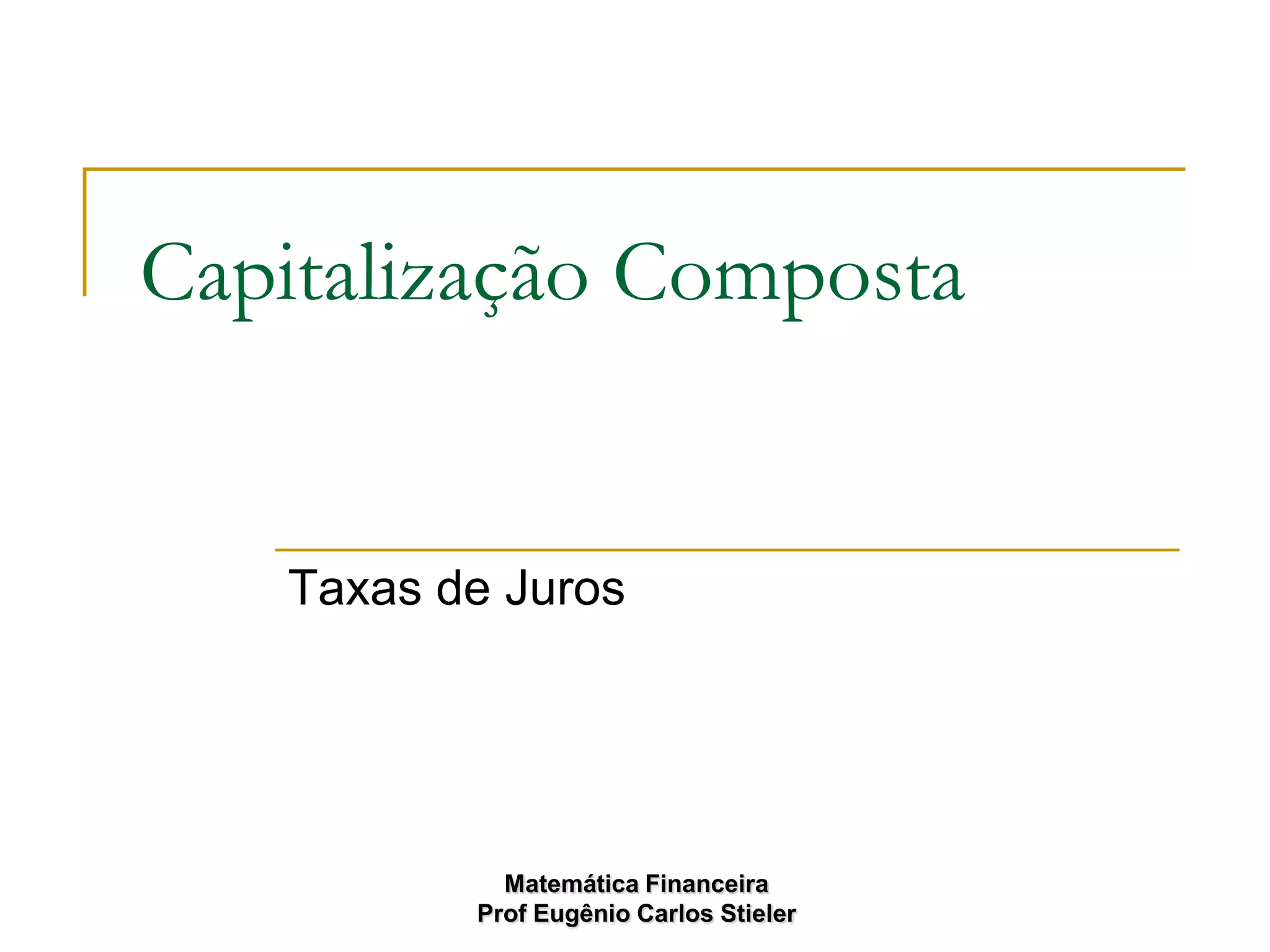 O documento discute os conceitos de juros compostos e taxas de juros. Explica como os juros são capitalizados ao longo do tempo no cálculo de juros compostos e como isso resulta em um crescimento exponencial. Também descreve como converter entre diferentes taxas de juros e períodos de tempo.