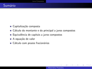 2) Fórmulas para calcular o montante e o valor presente a juros compostos;