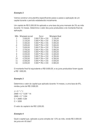 O documento explica o funcionamento dos juros simples, definindo a fórmula matemática utilizada para o cálculo e apresentando exemplos numéricos de aplicação. Nos juros simples, os juros incidem apenas sobre o capital inicial e não são capitalizados a cada período. A fórmula para cálculo dos juros é J = C * i * t, onde C é o capital, i a taxa de juros e t o tempo de aplicação.