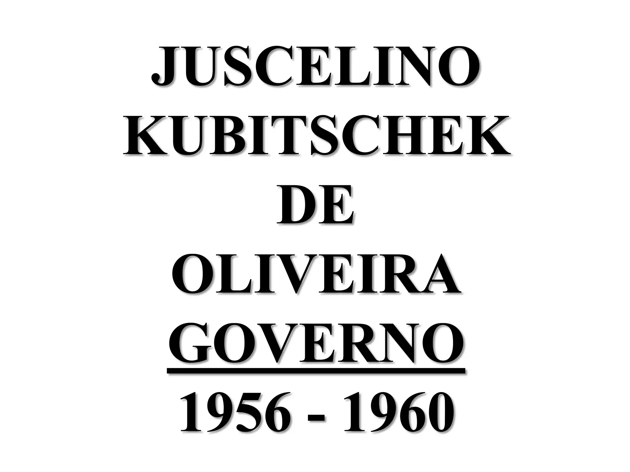 Juscelino Kubitschek foi presidente do Brasil de 1956 a 1960. Seu governo foi marcado pelo "Plano de Metas" e pela construção de Brasília, com foco no crescimento econômico através da industrialização e integração do território brasileiro. Seu mandato resultou em altas taxas de crescimento do PIB, porém também aumento da dívida externa e inflação.