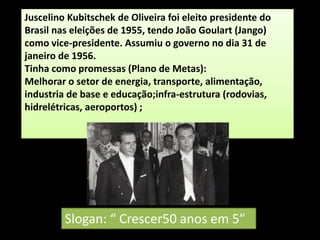 O documento resume a presidência de Juscelino Kubitschek entre 1956-1961, incluindo suas promessas de campanha de melhorar a infraestrutura e industrialização do Brasil em 5 anos, com foco na construção de Brasília. Também discute os impactos econômicos e sociais de suas políticas, como a entrada de multinacionais e êxodo rural para as cidades.